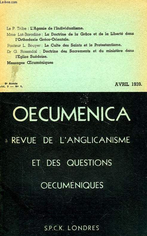 P. Tribe, L'agonie de l'individualisme. Mme Lot-Borodine, La doctrine de la grâce et de la liberté dans l'Orthodoxie gréco-orientale. Pasteur L. Boyer, Le culte des Saints et le Protestantisme... Classification Dewey : 284-Protestantisme