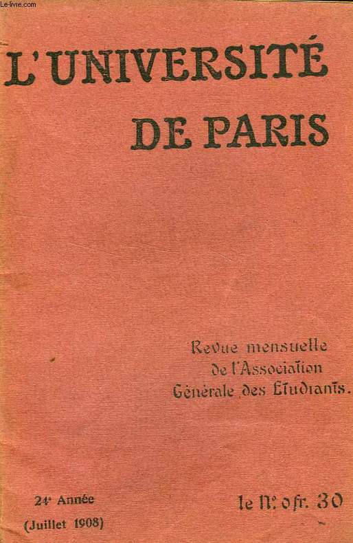 Association Générale des Etudiants de Paris. 1908. In-8. Broché. Bon état, Couv. convenable, Dos satisfaisant, Intérieur acceptable. Paginé de 378 à 424.. . . . Classification Dewey : 370-Education