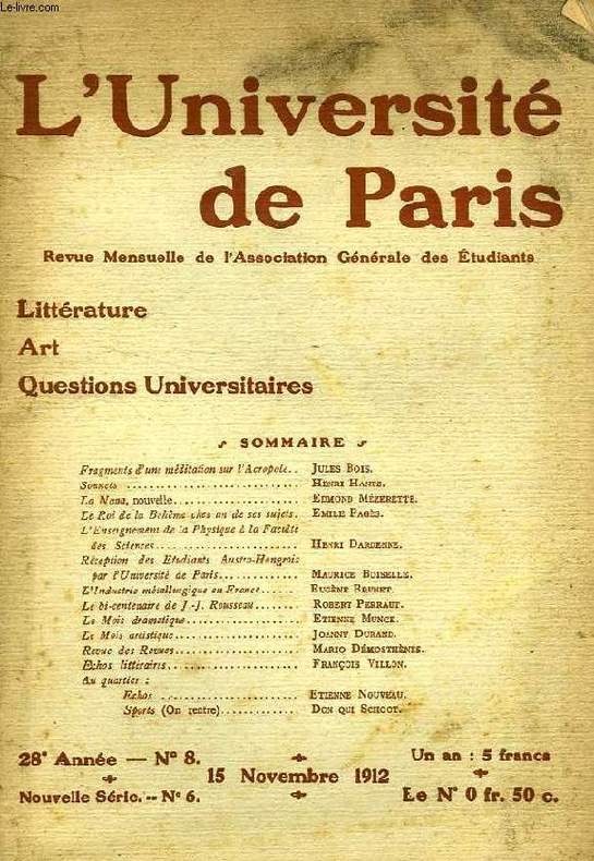 Rare. Fragments d'une méditation sur l'Acropole, Jules Bois. La Nana, Nouvelle, Edmond Mézerette. L'industrie métallurgique en France, Eugène Brunet. Le bi-centenaire de J.J Rousseau, Robert Perraut... Classification Dewey : 370-Education