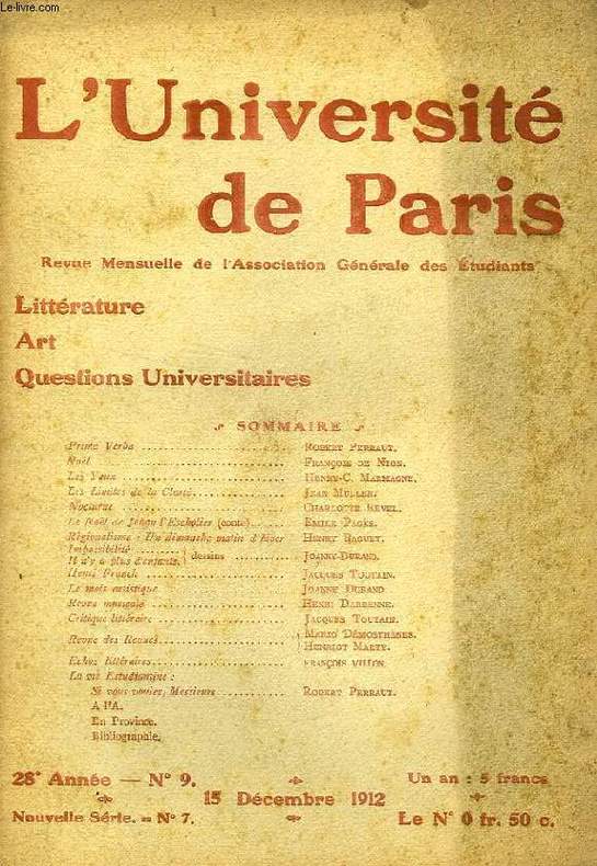 Association Générale des Etudiants de Paris. 1912. In-8. Broché. Etat d'usage, Tâchée, Dos satisfaisant, Intérieur acceptable. 30 pages. Illustré de quelques dessins en noir et blanc. Texte sur 2 colonnes.. . . . Classification Dewey : 370-Education