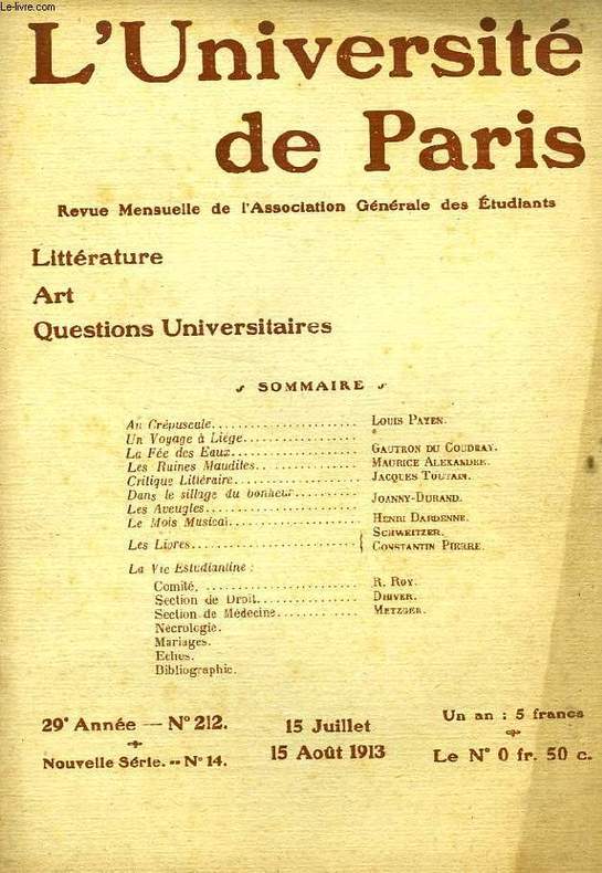 Association Générale des Etudiants de Paris. 1913. In-8. Broché. Bon état, Couv. légèrement passée, Dos satisfaisant, Intérieur acceptable. 22 pages. Illustré de quelques dessins en noir et blanc dans et hors texte. Texte sur 2 colonnes.. . . . Classification Dewey : 370-Education
