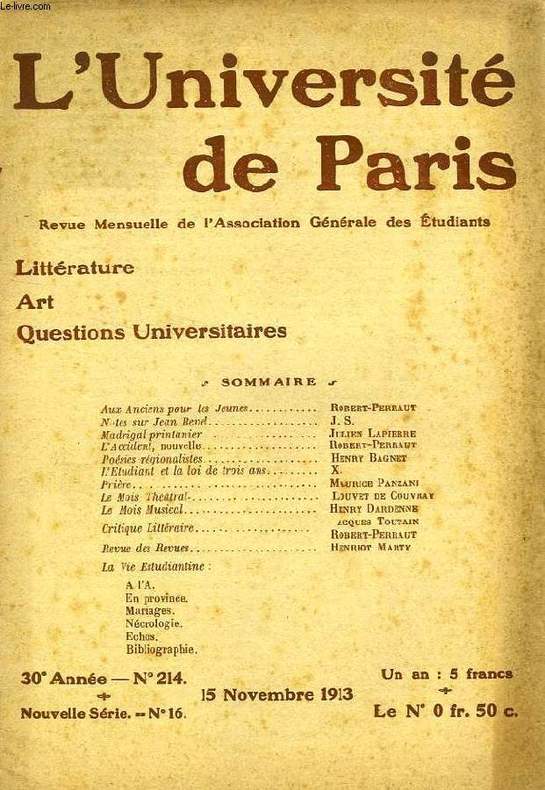 Rare. Nots sur Jean Revel, J.S. L'accident, Nouvelle, Robert-Perraut. Poésies régionalistes, Henry Bagnet. L'étudiant et la loi de trois ans... Classification Dewey : 370-Education