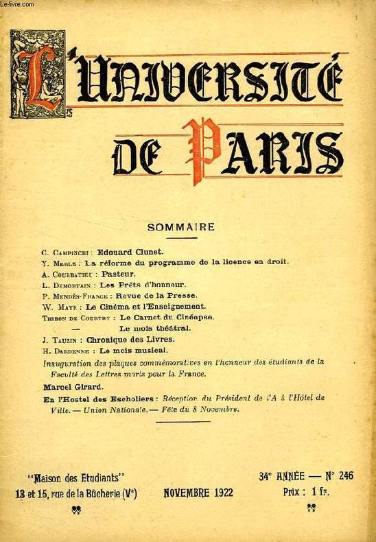 Rare. C. Campinchi, Edouard Clunet. Y Merle, La réforme du programme de la licence de droit. A. Courbatieu, Pasteur. L. Demortain, Les prêts d'honneur. P. Mendès-France, revue de la Presse. W. Mayr, le cinéma et l'enseignelent. Thibon de Courtry, Le Carnet du Cinéopse... Classification Dewey : 370-Education