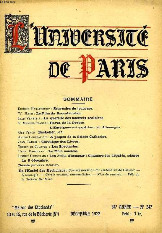 Rare. Edmond Haraucourt, Souvenirs de jeunesse. W. Mayr, Le film du baccalauréat. Jean, Vénéttis, La querelle des manuels scolaires. Guy Péron, Bachelièr...e ! André Courbatieu, A propos de Sainte Catherine. Dessin de Jean Morisot... Classification Dewey : 370-Education
