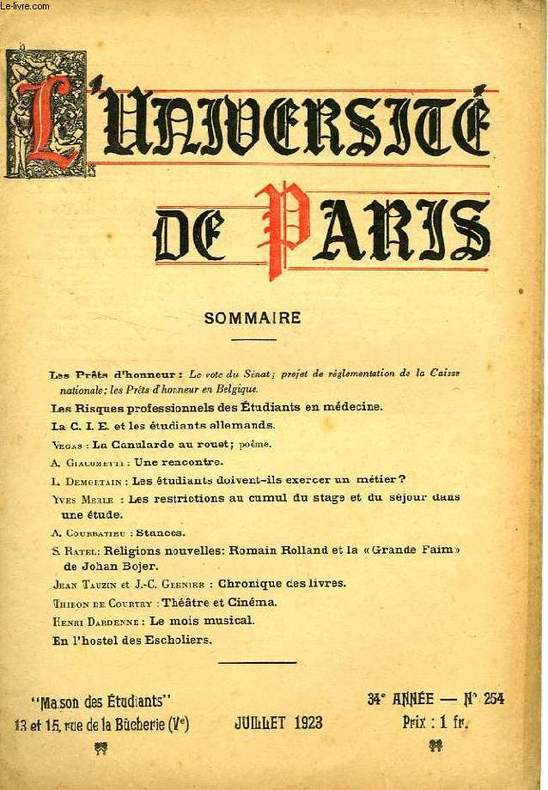 Rare. Les prêts d'honneur, Le vote du Sénat. Les risques professionnels des étudiants en Médecine. Vegas, La Canularde au rouet, Poème. L. Demortain, Les étudiants doivent-ils exercer un métier ? S. Ratel, Religions nouvelles: Romain Rolland et la 'Grande faim' de Johan Bojer... Classification Dewey : 370-Education