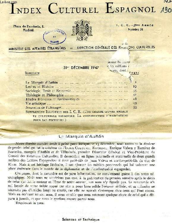 Très rare. Sommaire du n° 24, déc. 1947: Le Marquis d'Auñon. Lettres et Histoire. Sociologie, Droit et Economie. Théologie et Philosophie. Etudes bibliques et ecclésiastiques. Vie artistique, etc. Sommaire du n° 279-281, avril-juin 1969: Bibliografia y temas generales. Teologia y Ciencias eclesiasticas. Filosofia. derecho. Economia. Sociologia y Politica. Letras... Classification Dewey : 946-Espagne, Portugal