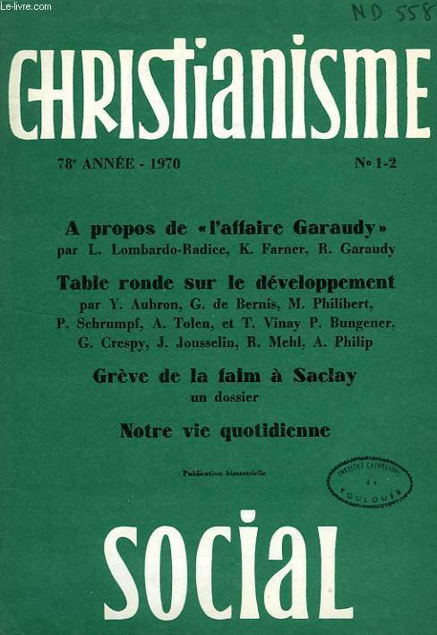 A propos de 'l'affaire Garaudy', L. Lombardo-Radice, K. Farner, R. Garaudy. Table ronde sur le développement, Y AUbron, G. de Bernis, A. Tolen... Classification Dewey : 260-Théologie sociale chrétienne