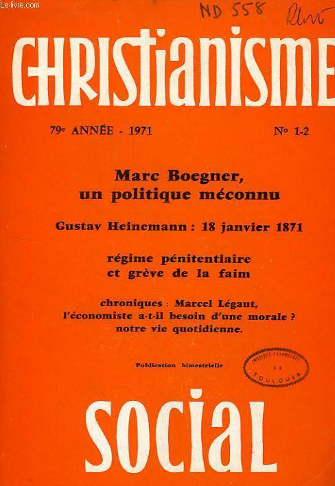 Marc Boegner, un politique méconnu. Gustav Heinemann, 18 jan 1871. Régime pénitentiaire et grève de la faim... Classification Dewey : 260-Théologie sociale chrétienne
