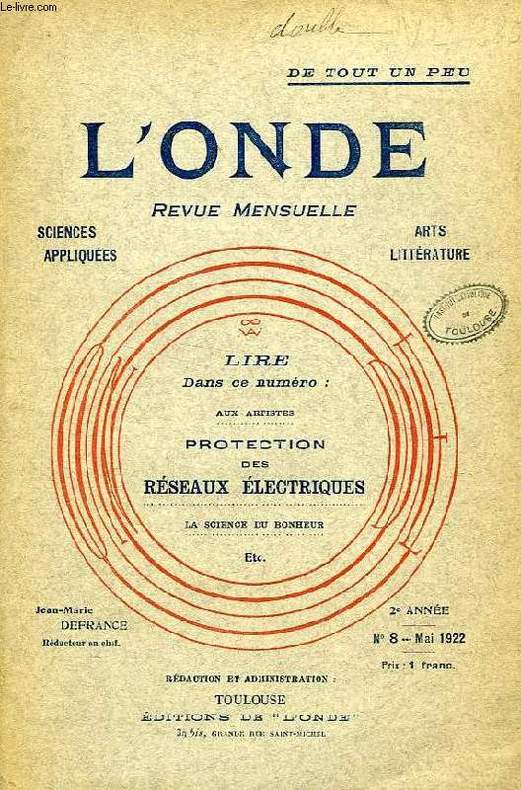 L'Onde, Toulouse. 1922. In-8. Broché. Etat d'usage, Couv. légèrement passée, Dos satisfaisant, Intérieur acceptable. Plaquette de 40 pages illustrée de nombreux dessins en noir et blanc dans le texte. Tampon et annotation de bibliothèque sur le 1er plat. Quelques feuillets légèrement abîmés sur le bord.. . . . Classification Dewey : 537-Electricité