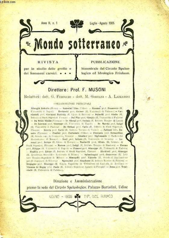 Circolo Speleologico, Udine. 1905. In-8. Broché. Etat d'usage, Couv. légèrement passée, Dos abîmé, Intérieur acceptable. Plaquette de 20 pages illustrée de dessins et photo-gravures en noir et blanc dans le texte. Plats se détachant.. . . . Classification Dewey : 450-Italien, roumain, rhéto-romain