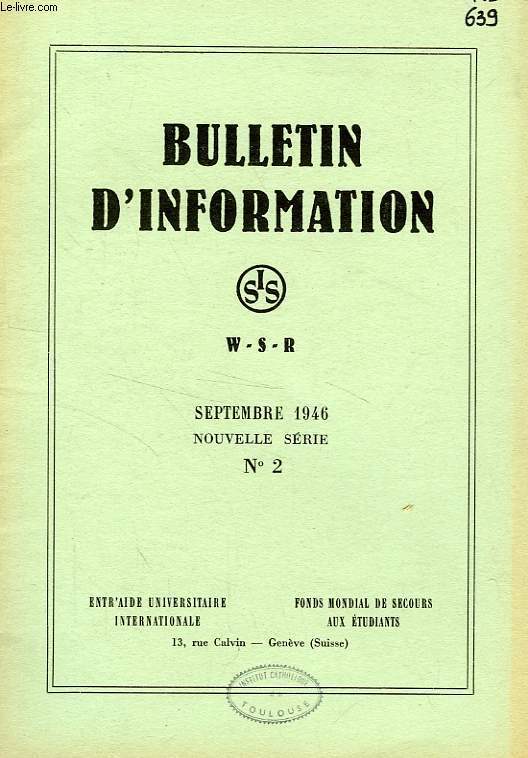 Entr'Aide Universitaire Internationale, Genève. 1946. In-8. Broché. Bon état, Couv. convenable, Dos satisfaisant, Intérieur frais. Plaquette paginée de 29 à 67. Tampons et annotations de bibliothèque sur le 1er plat et en 1re page.. . . . Classification Dewey : 370-Education