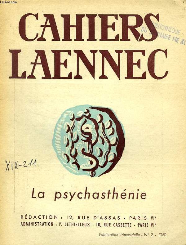 Psychasténie et vocation, Dr Eck et P. Ch. Larere. Traitement de la psychasténie, Dr Le Moal. La constitution émotive, Dr J. Barbier... Classification Dewey : 150-Psychologie
