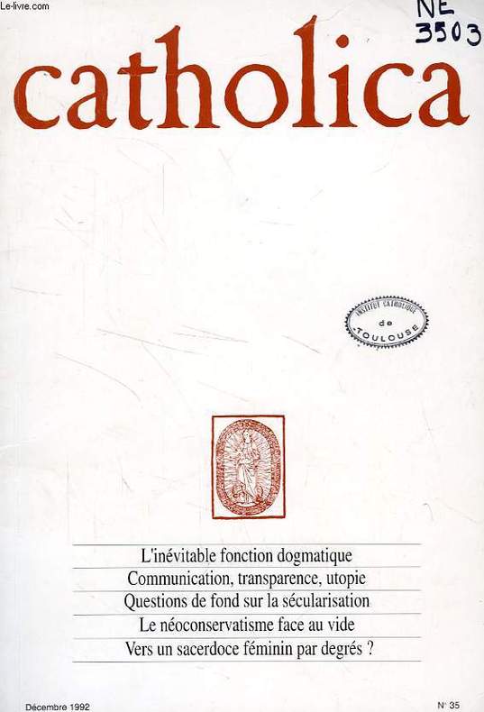 Catholica. 1992. In-8. Broché. Bon état, Couv. convenable, Dos satisfaisant, Intérieur frais. 79 pages. Annotations et tampons de bibliothèque sur le dos, le 1er plat et en 1re page.. . . . Classification Dewey : 210-Philosophie et théorie