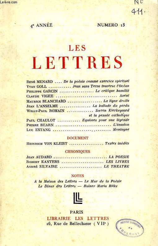René Menard, De la poésie comme exercice spirituel. Yvan Goll, Jean sans Terre traverse l'Océan. Willy-Paul Romain, Soeren Kierkegaard et la pensée catholique. Heinrich von Kleist, Textes inédits... Classification Dewey : 0-GENERALITES