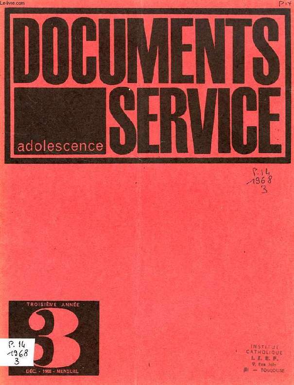 1968: n° 3 (déc.). 1969: n° 4-9 (jan.-aout). 1970: 2,3 (nov.-dec.). 1971: n° 4-10 (jan.-aout), 1-3 (oct.-déc.). 1972: n° 4-10 (jan.-juillet), 1-3 (oct.-déc.). 1973: n° 4-10 (jan.-aout), 1-3 (oct.-déc.). 1974: n° 5-7, 9-11 (fév.-déc.). 1975: n° mars, mai-juin, sept., nov. 1976: n° 1, 3, 7, 8. 1977: n° 9, 13-16. 1978: n° 17-24. 1979: n° 25-32. 1980: n° 33, 34, 37, 39, 40. 1981: n° 42-46. 1982: n° 47-52. 1983: n° 53, 54, 56, 57, 1984: n° 58-64. 1985: n° 64-66, 68. Du n° 3, 3e année, déc. 1968, au n° 68 (nouvelle série), juin 1985. Sommaire du n° 3, déc. 1968: En l'an 2000, on pourra choisir le sexe des enfants. 'Que le lycée devienne notre maison'. 'Je suis contre le fric...' 'J'achète des chaussures à 200 F.' Dieu est jeune dans les églises modernes, vieux ailleurs. L'étude grammaticale de l'image en 6e. Le théâtre dans la classe. Pour évangéliser, il faut prendre les jeunes où ils en sont, etc. Sommaire du n° 68, juin 1985: Les crises d'identité. Mono-parentalité. Le rire des jeunes. La pédagogie du voyage. La lutte contre 'l'été chaud'... Classification Dewey : 155.5-Psychologie des adolescents