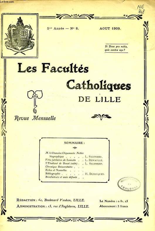 M. le Chanoine Cliquennois, Notice biographique, L. Salembier. Fêtes jubilaires de Louvain, L. Dewaulle. L'Etudiant de Douai (suite), L. Salembier... Classification Dewey : 370-Education