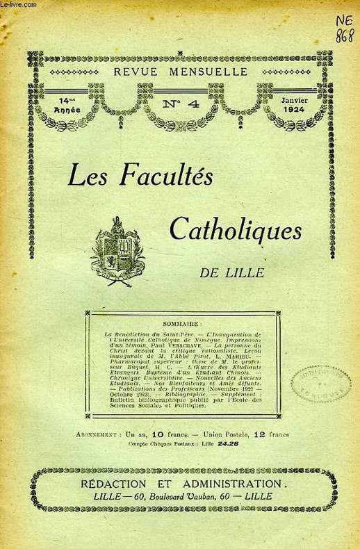 Facultés Catholiques de Lille. 1924. In-8. Broché. Bon état, Couv. convenable, Dos satisfaisant, Intérieur acceptable. Plaquette paginée de 98 à 127. Tampons et annotations de bibliothèque sur le 1er plat et en 1re page.. . . . Classification Dewey : 370-Education