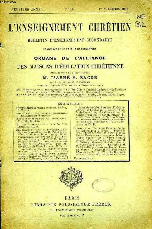 Du n° 21, 9e année, nov. 1890, au n° 3, 75e année, déc. 1961. Avec de nombreux suppléments pour les années 1925-1932. Premières années: Organe de l'Alliance des Maisons d'Education Chrétienne, sous la dir. de l'Abbé E. Ragon. Sommaire du n° 21, nov. 1890: L'explication de textes au Baccalauréat, E. Ragon. Instructions et règlements universitaires, Enseignement du français. Grandeur et décadence des littératures, 2e article, C. Huit. La nouvelle loi militaire et les Collèges libres, E. Ragon. Bibliographie. Chronique. Correspondance. Sommaire du n° 3, déc. 1961: S.E. Mgr Blanchet, Du solide. Pierre Sage, Douceur. Louis Ruy, Le sens de la vie. Ch. guignier, Les travaux pratiques de Géographie. Education féminine, 35e Congrès de l'Union. Henri Platelle, Bulletin d'Histoire... Classification Dewey : 370-Education