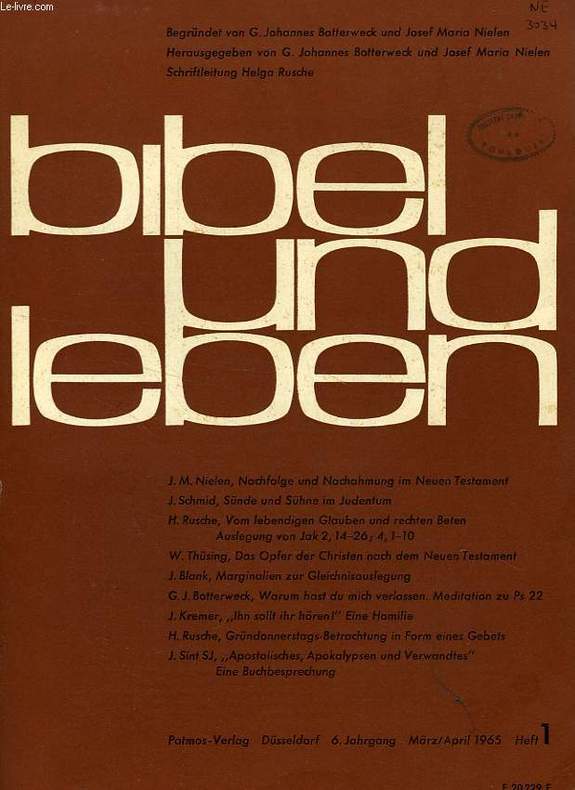 J.M. Nielen, Nachfolge und Nachahmung im Neuen Testament. J. Schmid, Sünde und Sûhne im Judentum. W. Thüsing, Das Opfer der Christen nach dem Neuen Testament... Classification Dewey : 430-Langues germaniques. Allemand