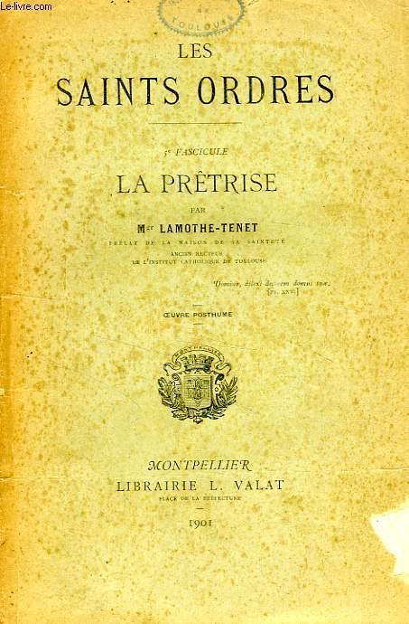 Librairie L. Valat, Montpellier. 1901. In-12. Broché. Etat passable, Plats abîmés, Dos abîmé, Quelques rousseurs. 317 pages. Page de titre et 16 premières pages manquantes. Tamponde bibliothèque sur le 1er plat Dos fendu avec cahiers détachés. 1er plat détaché.. . . . Classification Dewey : 265-Rites, cérémonies et sacrements