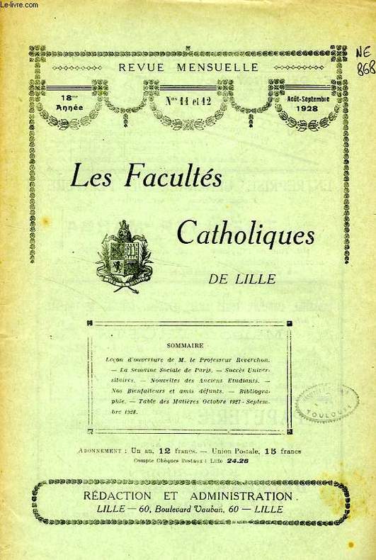 Facultés Catholiques de Lille. 1928. In-8. Broché. Etat d'usage, Couv. légèrement passée, Dos satisfaisant, Intérieur acceptable. Plaquette paginée de 282 à 312. Tampons et annotations de bibliothèque sur le 1er plat et en 1re page.. . . . Classification Dewey : 370-Education