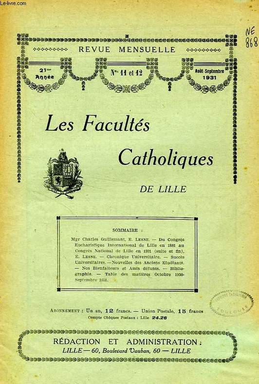 Mgr Charles Guillemant, E. Lenne. Du Congrès eucharistique international de Lille en 1881 au Congrès National de Lille en 1931 (fin), E. Lesne... Classification Dewey : 370-Education