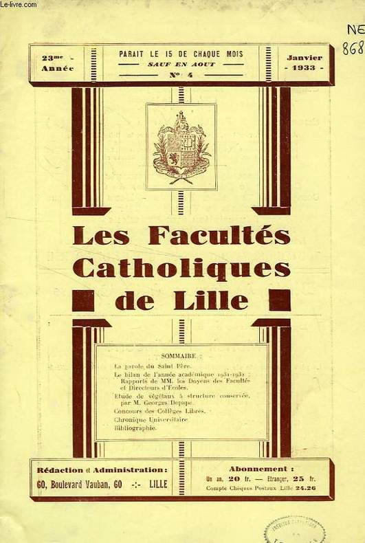 Facultés Catholiques de Lille. 1933. In-8. Broché. Bon état, Couv. convenable, Dos satisfaisant, Intérieur frais. Plaquette paginée de 98 à 140, illustrée de photos en noir et blanc dans le texte. Tampons et annotations de bibliothèque sur le 1er plat et en 1re page.. . . . Classification Dewey : 370-Education