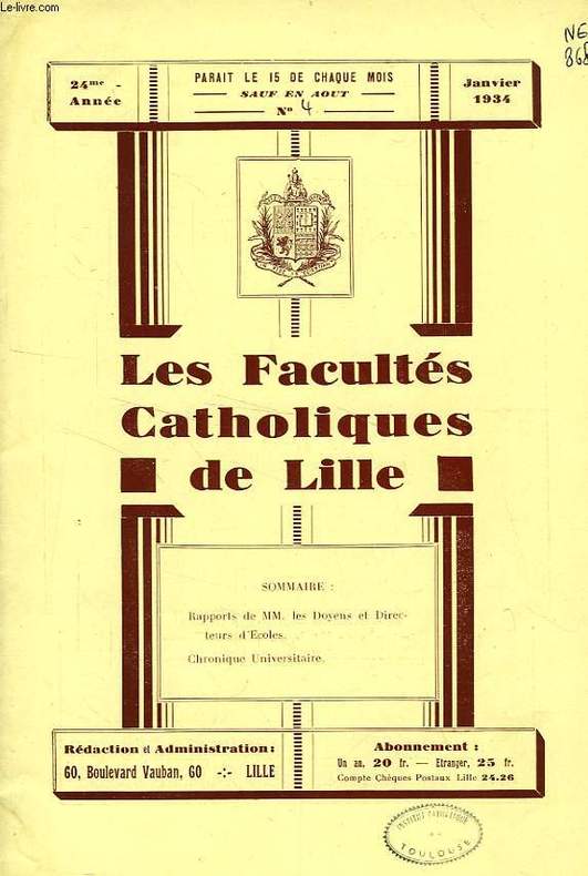 Facultés Catholiques de Lille. 1934. In-8. Broché. Bon état, Couv. convenable, Dos satisfaisant, Intérieur frais. Plaquette paginée de 98 à 143, illustrée de photos en noir et blanc dans et hors texte. Tampons et annotations de bibliothèque sur le 1er plat et en 1re page.. . . . Classification Dewey : 370-Education