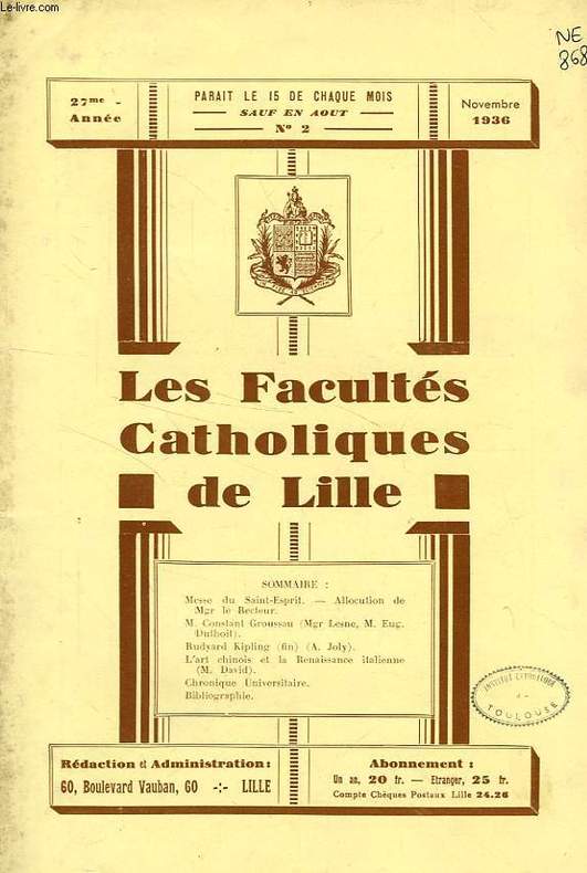 Facultés Catholiques de Lille. 1936. In-8. Broché. Bon état, Couv. convenable, Dos satisfaisant, Intérieur frais. Plaquette paginée de 30 à 56, illustrée d'une photo en noir et blanc dans le texte. Tampons et annotations de bibliothèque sur le 1er plat et en 1re page.. . . . Classification Dewey : 370-Education