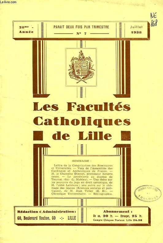 Facultés Catholiques de Lille. 1938. In-8. Broché. Bon état, Couv. convenable, Dos satisfaisant, Intérieur frais. Plaquette paginée de 224 à 254. Tampons et annotations de bibliothèque sur le 1er plat et en 1re page.. . . . Classification Dewey : 370-Education