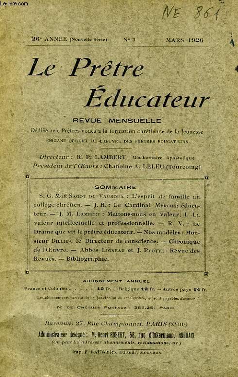 S.G. Mgr Sagot du Vauroux, L'esprit de famille au collège chrétien. Le cardinal Mercier éducateur. Monsieur Dillies, Le Directeur de conscience... Classification Dewey : 260-Théologie sociale chrétienne