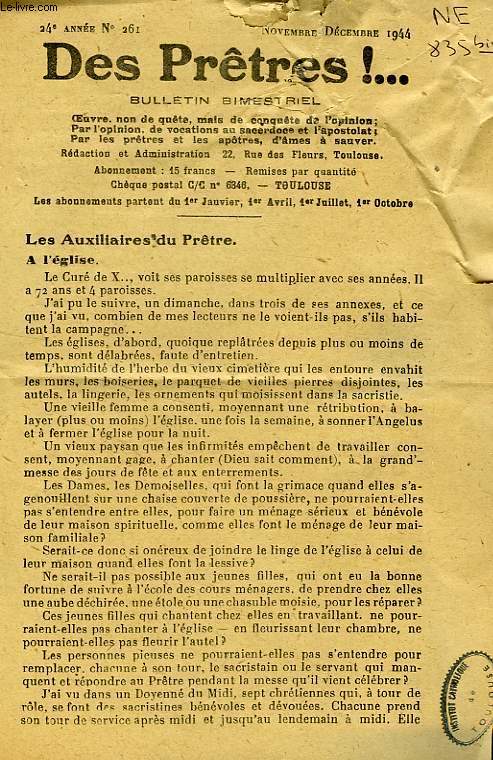 Imprimerie Catholique Saint-Cyprien, Toulouse. 1944. In-8. En feuillets. Etat passable, Livré sans Couverture, Dos satisfaisant, Déchirures. Plaquette de 4 pages. Tampon et annotations de bibliothèque en 1re page. Fortes déchirures.. . . . Classification Dewey : 260-Théologie sociale chrétienne