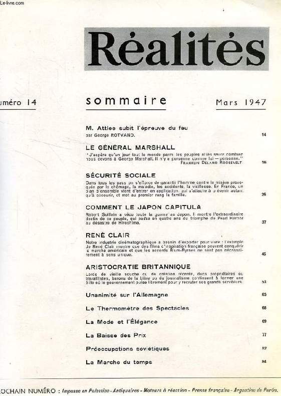 M. Attleee subit l'épreuve du feu, G. Rotvand. Le général Marshall. Comment le Japon capitula (illustré en couleur). rené Clair. Aristocratie britannique... Classification Dewey : 70.49-Presse illustrée, magazines, revues