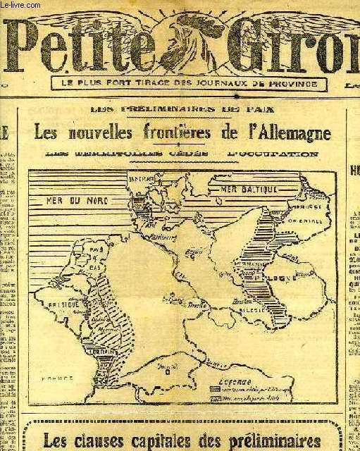 La Petite Gironde. 1919. In-Plano. En feuillets. Bon état, Couv. convenable, Dos satisfaisant, Intérieur acceptable. 2 pages. Texte sur 7 colonnes. Illustré d'une carte en noir et blanc.. . . . Classification Dewey : 940.3-Première Guerre mondiale 1914-1918
