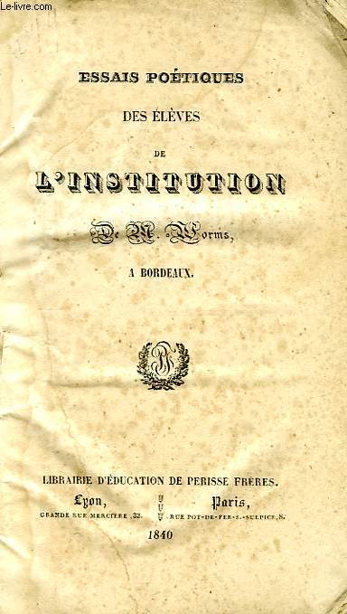 Librairie d'Education de Périsse Frères, Lyon, Paris. 1840. In-12. Broché. Etat d'usage, Couv. légèrement passée, Dos abîmé, Rousseurs. 314 pages. Couverture muette refaite. Manque sur le dos. Moillures.. . . . Classification Dewey : 841-Poésie