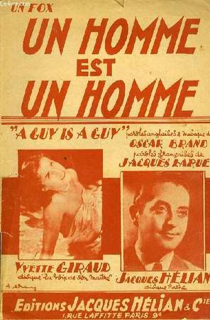 JACQUES Hélian et Cie.. 1952. In-8. En feuillets. Bon état, Couv. convenable, Dos satisfaisant, Intérieur frais. 2 pages de partitions, premier plat illustré des photographies d'Yvette Giraud et de Jacques Hélian, accrocs dans les pliures. . . . Classification Dewey : 780.26-Partitions