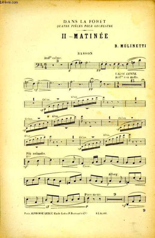 ALPHONSE LEDUC. non daté. In-8. En feuillets. Etat d'usage, Couv. convenable, Dos satisfaisant, Quelques rousseurs. Non paginé, environ 52 pages. Partition orchestre pour : Piano conducteur, Contrebasse, Clarinette en LA, hautbois, Grandes Flûtes, Violoncelles, Altos, 1er et 2nd Violons, Cors en FA et Basson.. . . . Classification Dewey : 780.26-Partitions