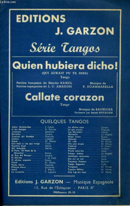 J. GARZON. non daté. In-8. En feuillets. Bon état, Couv. convenable, Dos satisfaisant, Intérieur frais. Non paginé, environ 29 pages. 2 Partitions orchestre en recto verso pour : Saxo Alto Mi Bémol, Contrebasse, Piano, Violon A B et C Bandonéon A B et C. Quelques tâches sur les pages n'altérant pas la lecture de la partition.. . . . Classification Dewey : 780.26-Partitions