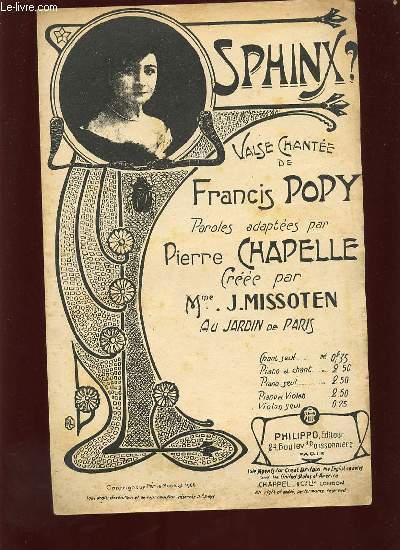 PHILIPPO.. 1906.. In-8. Broché. Etat d'usage, Couv. légèrement passée, Dos satisfaisant, Intérieur acceptable. 3 pages de partitions. Gravure de Mme. J. MISSOTEN.. . . . Classification Dewey : 780.26-Partitions