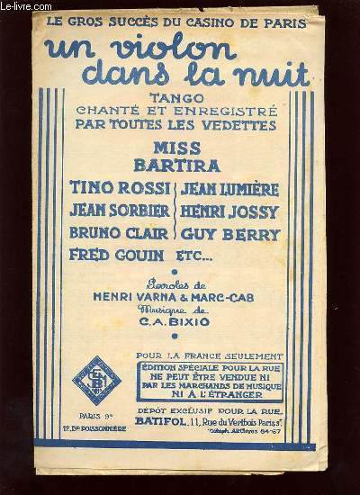 Chanté et enregistré par toutes les vedettes, Miss Bartira, Tino Rossi, Jean Lumière, Bruno Clair, Guy Berry, Jean Sorbrier etc... Classification Dewey : 780.26-Partitions
