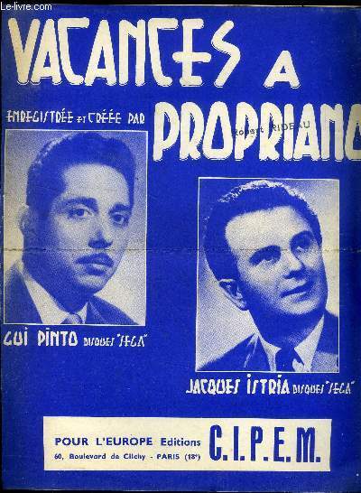 C.i.p.e.m. 1960. In-8. Broché. Bon état, Couv. convenable, Dos satisfaisant, Intérieur frais. 4 pages augmentées de 2 pages de partitions en noir et blanc. Musique de J. Istria et S. Luino. C.I.P.E.M 395. Clé de Sol et clé de Fa. . . . Classification Dewey : 780.26-Partitions