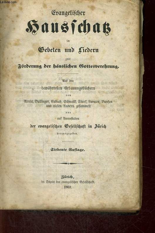 IM DEPPOT DER EVANGELISCHEN GESELLSCHAFT. 1861. In-8. Cartonnage d'éditeurs. Etat passable, Coins frottés, Dos abîmé, Quelques rousseurs. 500 pages. Texte en allemand (caractères gothique). Manque le dos. Plat partiellement détachés. Quelques pages détachées.. . . . Classification Dewey : 200-RELIGION