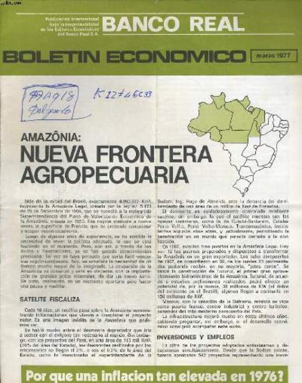 BANCO REAL. 1977. In-4. Broché. Etat d'usage, Couv. légèrement passée, Dos satisfaisant, Intérieur frais. 8 pages. Magazine en 2 feuillets pliés non reliés. Premier plat illustré en noir et blanc et monochrome vert. Ecritures au stylo sur le premier plat n'altérant pas la lecture.. . . . Classification Dewey : 330-Economie