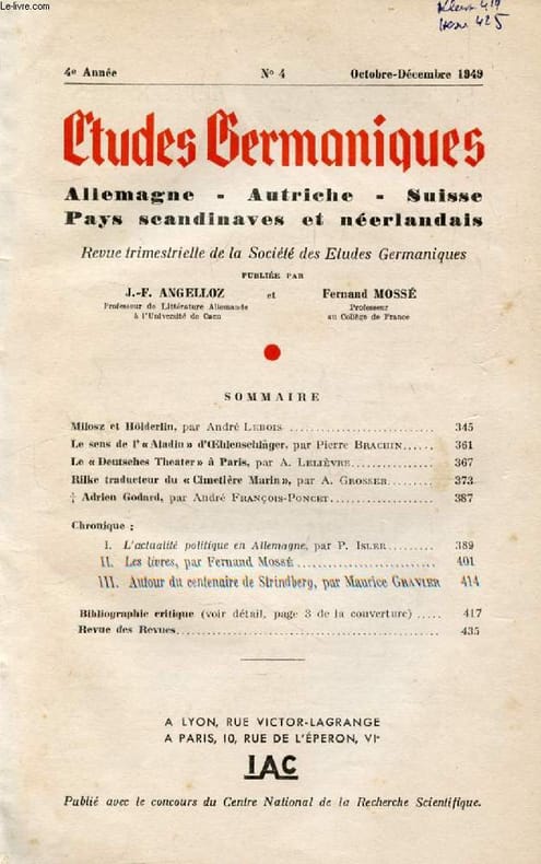 Sommaire: Milosz et Hölderlin, par André Lebois. Le sens de l'« Aladin » d’Oehlenschläger, par Pierre Brachin. Le « Deutsches Theater » à Paris, par A. Lelièvre. Rilke traducteur du « Cimetière Marin », par A. Grosser. + Adrien Godard, par André François-Poncet... Classification Dewey : 943-Allemagne, Autriche, Hongrie