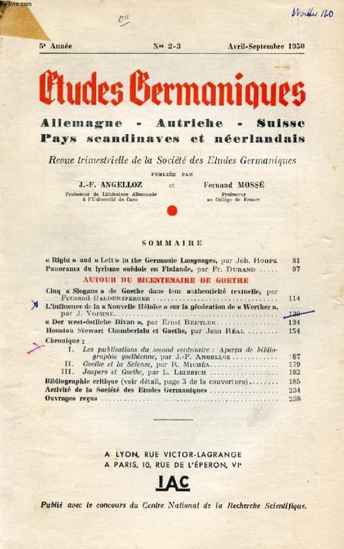 Sommaire: « Right » and « Left » in the Germanic Languages, par Joh. Hoops. Panorama du lyrisme suédois en Finlande, par Fr. Durand. AUTOUR DU BICENTENAIRE DE GOETHE. Cinq « Slogans » de Goethe dans leur authenticité textuelle, par Fernand Baldensperger. L’influence de la « Nouvelle Héloïse » sur la génération de « Werther », par J. Voisine. « Der west-ôst liehe Divan », par Ernst Beutler. Houston Stewart Chamberlain et Goethe, par Jean Réal... Classification Dewey : 943-Allemagne, Autriche, Hongrie