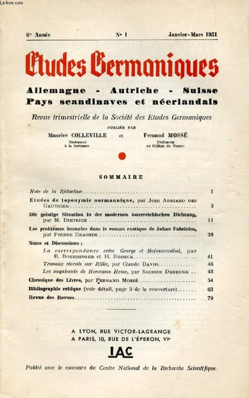 Sommaire: Note de la Rédaction. Etudes de toponymie normannique, par Jean Adigard des Gautries. Die geistige Situation in der modernen österreichischen Dichtung, par M. Dietrich. Les problèmes humains dans le roman exotique de Johan Fabricius, par Pierre Brachin. Notes et Discussions: La correspondance entre George et Hofmannsthal, par R. Boehringer et H. Bodeck... Classification Dewey : 943-Allemagne, Autriche, Hongrie