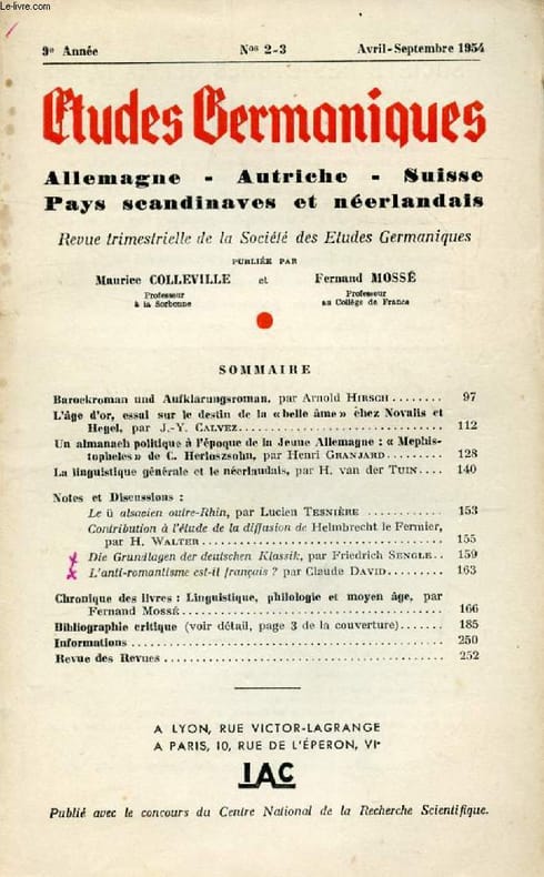 Société des Etudes Germaniques - IAC. 1954. In-8. Broché. Bon état, Couv. convenable, Dos fané, Intérieur acceptable. Paginé de 98 à 256. Annotations sur le 1er plat.. . . . Classification Dewey : 943-Allemagne, Autriche, Hongrie