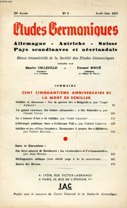 Sommaire: CENT CINQUANTIÈME ANNIVERSAIRE DE LA MORT DE SCHILLER. Schiller et Rousseau : Sur la genèse des « Brigands », par Roger Ayrault. Un grand carrefour des lettres allemandes : « Die Künstler », par Claude David. La « Jeanne d’Arc » de Schiller, par Pierre Grappin. L’idéologie politique dans « Guillaume Tell », par Robert Leroux. Schiller et les « Pères Souabes », Remarques à propos des «Räuber», par Robert Minder... Classification Dewey : 943-Allemagne, Autriche, Hongrie