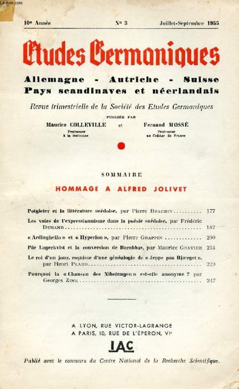 Sommaire: HOMMAGE A ALFRED JOLIVET. Potgieter et la littérature suédoise, par Pierre Brachin. Les voies de l’expressionnisme dans la poésie suédoise, par Frédéric Durand. « Ardinghello » et « Hyperion », par Pierre Grappin. Pär Lagerkvist et la conversion de Barabbas, par Maurice Gravier. Le roi d’un jour, esquisse d’une généalogie de « Jeppe paa Bjaerget », par Henri Plard. Pourquoi la « Chanson des Nibelungen » est-elle anonyme ? par Georges Zink... Classification Dewey : 943-Allemagne, Autriche, Hongrie