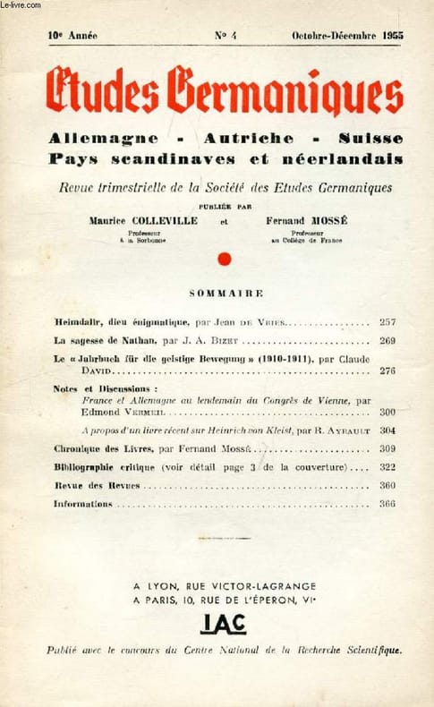 Sommaire: Heimdallr, dieu énigmatique, par Jean de Vries. La sagesse de Nathan, par J. A. Bizet. Le «Jahrbuch für die geistige Bewegung » (1910-1911), par Claude David. Notes et Discussions : France et Allemagne au lendemain du Congrès de Vienne, par Edmond Vermeil. A propos d’un livre récent sur Heinrich von Kleist, par R. Ayrault... Classification Dewey : 943-Allemagne, Autriche, Hongrie